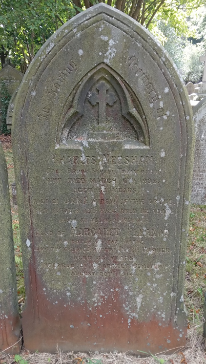 The gravestone in Christ Church Graveyard marks the burial place of Charles Neesham, his wife Jane (Kilburn) Neesham and their daughter Margaret Eleanor (Neesham) Barker.