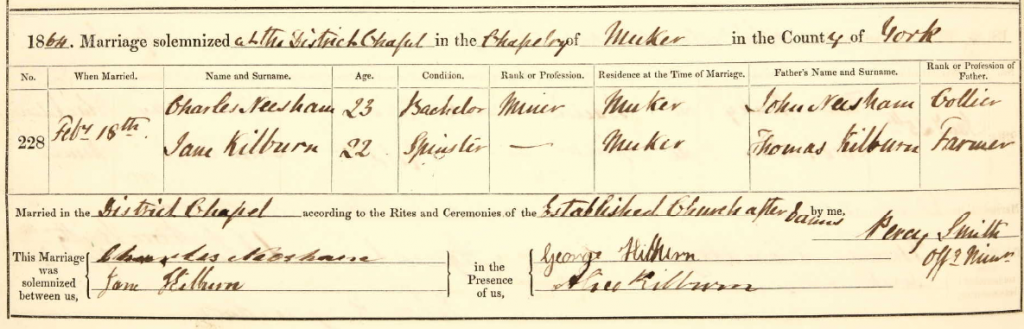 Charles Neesham was born in Evenwood, County Durham to John and Elizabeth Neesham. His father John was a pitman, most likely working at the Randolph coal mine in the town. By the time Charles was 10 his family had moved 30 miles southwest to Muker, in Richmond North Yorkshire. Charles’ father now worked as a lead miner in one of the many smelting and lead mines in Swaledale. It was a hard life, and the demise of the lead mine had already started by the time John moved his family to the Yorkshire lead mines. By 1871 there were few jobs and miners started to migrate out of Muker as the lead mining industry collapsed.