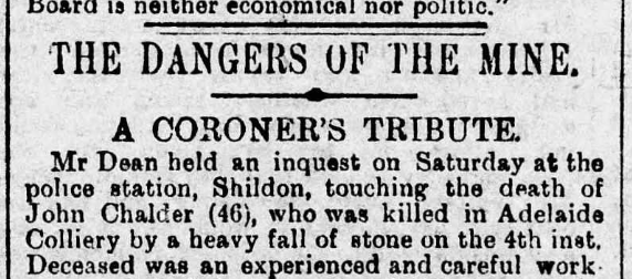 Mr Dean held an inquest on Saturday at the police station, in Shildon touching the death of John Chalder (46), who was killed in Adelaide Colliery by a heavy fall of stone on the 4th inst. Deceased was a careful and experienced workman, and had been employed 20 years at the colliery. The evidence of Charles Neesham who was working along with the deceased shoed that the former, upon returning to where Chalder was working discovered an obstruction in the way of his tub. He called out several times to Chalder but no answer came and upon the approach of John Blekin, master shifter, they made their way to the other end of the fall, and then perceived that their unfortunate, fellow workman was entirely covered by the fall, which was several tons in weight. Neesham declared that they had perceived nothing unusual in the roof, and a very short time previously deceased and he sat under the fatal spot and had their bait. Witness was much affected by the sad occurrence and was unable to stay to assist in extricating the mangled remains. The master shifter said the men were employed three hours and a half in removing the mass which covered the deceased. The stone above kept falling in small pieces whilst the men were at work and they had to stand and reach over to clear the debris, so dangerous was the place. At the conclusion of the evidence the coroner feelingly remarked: