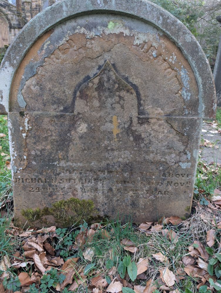 “Semicircular stone, very badly eroded”, according to the TAS; then “Also of Sarah Ann, daughter of the above Richard Sutcliffe, who died Novr 24th 1878 in her 34th year” according to us. Both incorrect! This is actually the grave of Richard and his wife Sarah, no Ann, and she died in her 81st year.