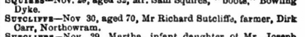 Whether Sarah and Richard crossed paths during the brief time they were living nearby – with nearby being loose, since Richard and family were at Lane End near Heptonstall in 1841 – is unclear, but they did later, somehow. They were married at Halifax in 1850 and at first moved in to the not-that-big house at Mount Pleasant; however soon the couple and their respective children still at home would find themselves be living at Dirk Carr Farm, just a little to the northeast of Bankfield in Akroyd. Richard for some reason decided to leave carpet weaving behind and went back to farming at an age when one would normally be thinking of taking a step back from hard work…why, we wonder? It was only 5 acres but none of the three boys still at home were involved in it. They were all working at the carpet factory still.