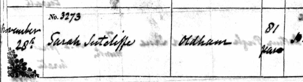 Sarah came back to Todmorden with her son John and his wife Mary, and lived with them and two of Mary’s brothers (including Howorth Stansfield) in their little house on Queen Street. Her son William stayed behind in Halifax, as did Thomas. Her daughter Ann meanwhile was now on her second marriage, to weaver James Johnson, and had moved to Oldham with him. When John died suddenly in 1873 Sarah made the decision to go live with Ann rather than with one of her other sons. That’s why she was living there in November 1878 when she died at the age of 81.