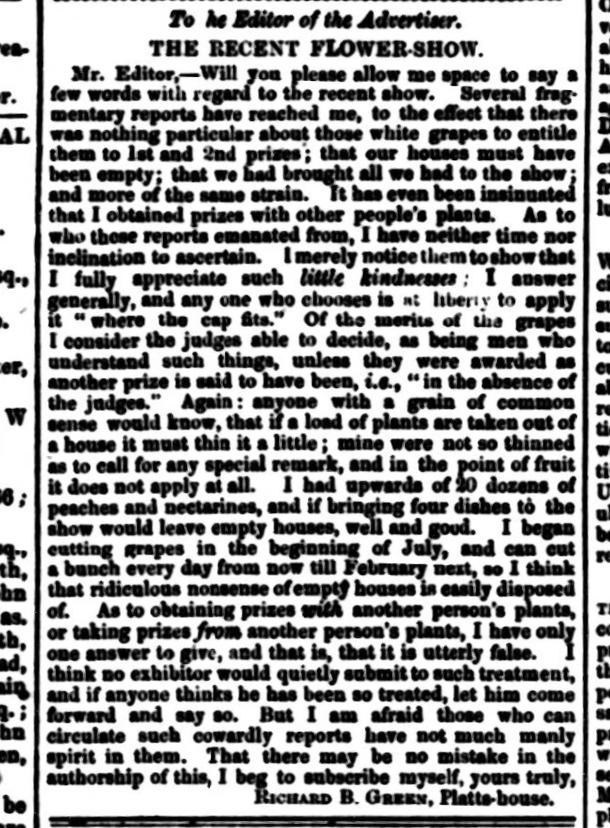 It’s likely that Richard worked for the Leyland and Naylor families at Walton Hall because he and Anne would pack up their three children in 1866 and bring them east to Todmorden, where Richard found himself employed as Samuel Fielden’s chief gardener at Platts House. Only the Fieldens here, at that point, would have had comparable wealth to the Leylands. “Black Sam” might have had local power but his servants didn’t always benefit from the same deference, and on Richard’s debut showing off his produce at the Flower Show in 1866 he won a few prizes but comments were passed in the newspaper to the effect that “there might as well have not been any judges present”, and Richard felt something was behind this remark sufficiently for him to write a snarky letter to the paper assuring everyone that he had, in fact, produced some very nice fruit and flowers indeed, and his position was nothing to do with the prize giving.