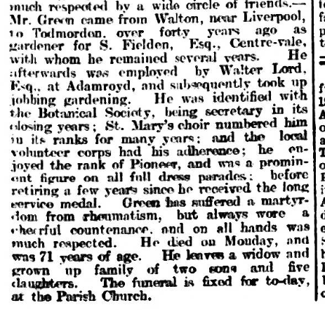 Richard and Anne continued to grow their family but in 1869 lost their sixth child and third son, Charles Harry, two months after he was born. They kept going though and soon whatever sore feelings 1866 brought were forgotten. Richard eventually became the Secretary for the Floral and Horticultural Society, Chairman for the Widows and Orphans Fund, and earned a bit more local respect as a result. He also continued to work for the Fieldens until the late 1870s when he took up working for Edward Lord at Adamroyd instead, and the Greens moved from Centre Vale to Barker Street to be nearer his new workplace. Because he was also clearly not occupied enough, he joined the choir at St. Mary’s and started helping out with the Shannon Botanical Society, serving the amateur gardeners of Millwood.