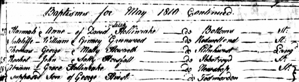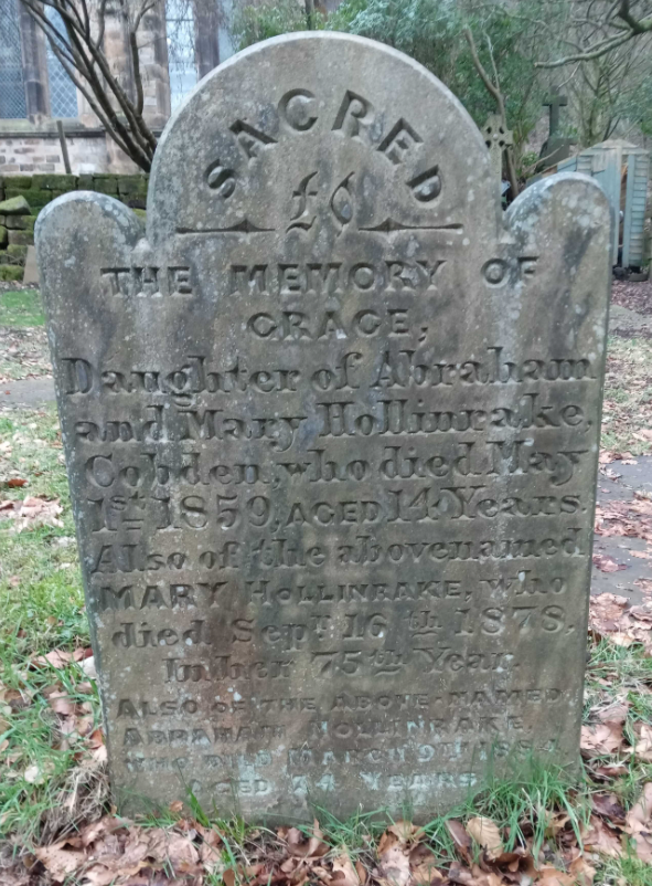 Abraham Hollinrake was, according to all the family trees on Ancestry, born in 1808 to Abraham and Mary (Heap) Hollinrake of Heptonstall. However, the Abraham buried here has an age on all other public records that tallies with a birth in 1810; and so we suspect there’s a chance he’s actually the son of Grace Hollinrake, an unmarried woman from New Shop in Stansfield – much closer to Todmorden – with his supposed father being a George Hirst from Todmorden. Grace Hollinrake died three years later at the age of 29 so what that meant for that Abraham is unknown.