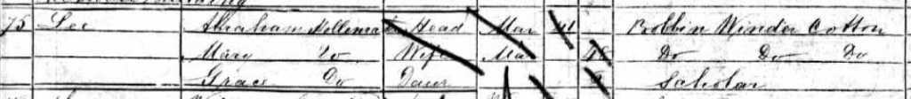 In 1836 he married Mary Greenwood of Langfield, having moved there and become a carder. Mary was seven years his senior and worked as a bobbin winder in a cotton mill. A detailed search of the GRO and baptism records seem to show that the couple only had a single child, their daughter Grace who arrived in September 1844 when Abraham was 34 and Mary was 41. She was baptised at Cross Stone. Abraham was by this point a “shop keeper” although whether this meant he was a grocer or was in some position looking after a “shop” (workplace, or warehouse?) isn’t clear. The family lived at Lee and stayed there for a long time until moving down to Todmorden, to Peel Street at Cobden, sometime after the 1851 Census.
