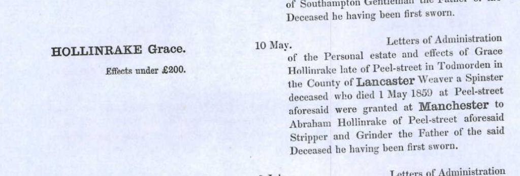 In 1859 Grace died from phthsis which would have come as a huge blow to the Hollinrakes. She had been working as a power loom weaver so brought money into the home, but also, for reasons unknown she was also in possession of some money of her own. Was this a bequest from an older relative? It took five years for probate to be settled but beyond even that little interesting tidbit, this is still something else because it’s the first time we’ve come across a minor who had an estate that needed settling at all.