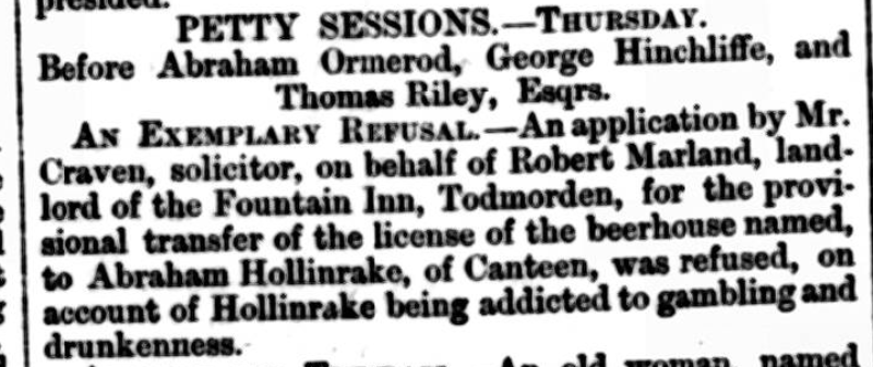 This mystery aside, what happened next? It’s hard to be sure because there was a surprising number of Abraham Hollinrakes knocking around, but it seems that he and Mary eventually moved to Lydgate, where they lodged with a James Greenwood (a relative of Mary’s?) and where Abraham got into a few bad habits – tactfully not explained in the local papers but described elsewhere as drinking and gambling. Is that where Grace’s money estate went? You’d hope not.