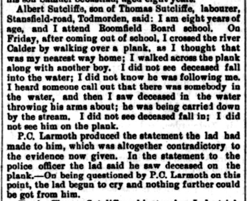 Albert would be a familiar feature in the newspapers later on due to his career as a talented and popular local cricketer, but his first newspaper appearance was memorable for less pleasant reasons. In August 1891 some boys from Roomfield School were playing on a plank which local contractor Benjamin Lumb had had placed across the river at Tipside to cross back and forth while working on a job. One boy, Samuel Sebastian Fielden, fell in and was swept away and drowned. Albert was the last boy there with him and to see him alive, and he was dragged before the coroner at the inquest to give his account of what happened and then be challenged (albeit lightly) about his story having changed in the meantime. He was only a boy, it’s hardly a surprise, and everyone was of the same opinion that he was overwhelmed by the experience. He was a child who saw a friend die.
