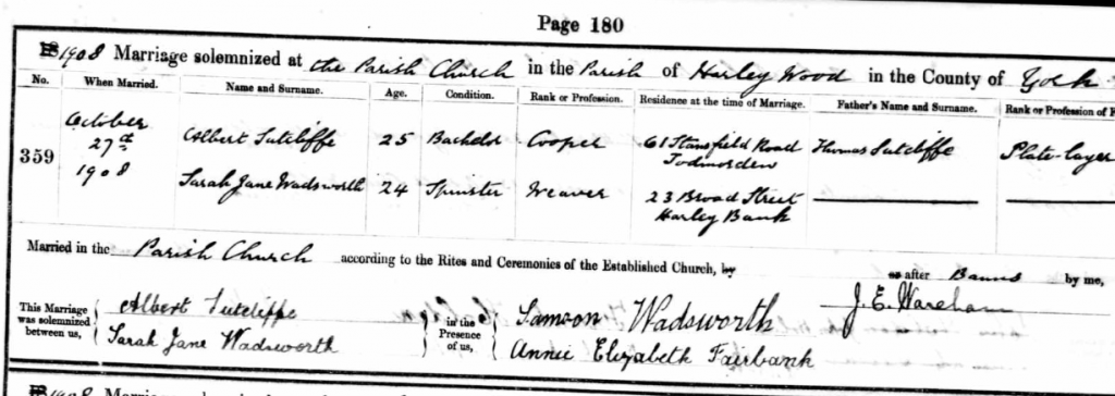 Now we move through some other family members to get to the second half of the story. Henry Astin, the second youngest, moved back to Rossendale at some point and there he married Elizabeth Law in 1851. He later brought his wife back to Todmorden and they settled back at Blind Lane, surprise surprise. Their third child, Elizabeth Alice Astin, married Thomas Sutcliffe in 1878 at the relatively young age of eighteen and they had three children together: Sarah Hannah, Charles William, and Albert, born in 1883. And so the second half of the story begins.