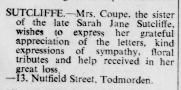 Sarah Jane was, like her great-grandparents in law, an offcumden, but this time hailing from the wilds of Scammonden near Halifax. She was the eldest of two children born illegitimately to her mother, Leah Wadsworth, and an unknown father – her sister Florence was two years younger and it’s unknown whether the two shared the same father. Whoever he was he wasn’t the type to settle down, and Leah moved to Todmorden where she and the girls lived with her sisters Sarah and Matilda for some time. By 1901 their parents Thomas and Mary had given up their farm at Hill Top in Barkisland due to bankruptcy and also come to Todmorden, where they moved in with Matilda and Sarah Jane and Florence…but Leah moved out, and was living with her cousin Mary Love on Store Street. This was probably because Leah had met James Crowther, a widower thirteen years her senior, and was getting ready to marry him. They wed in the autumn of 1901 and the couple had a son, and as for Sarah Jane and Florence? That was that. It would be interesting to know what James knew and didn’t know.