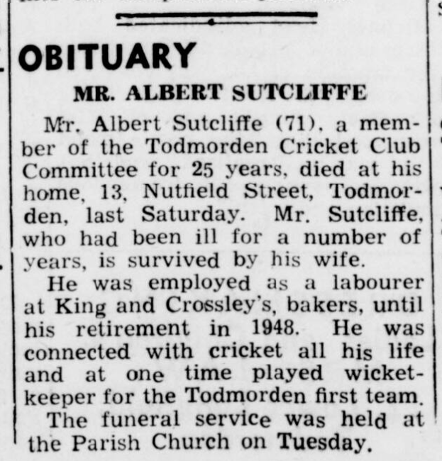 During WW1 Albert found himself in a reserved occupation due to his work with J. W. Helliwell at Millwood, making barrels for munitions (chemicals and gas), so he avoided being drafted. He continued on in this work after the war but eventually sought out something that perhaps didn’t pain his cricketing injuries too much – don’t forget about those broken thumbs – by becoming a baker’s assistant working for King and Crossley’s on Burnley Road, where the cafe is now. He was also busy on the Todmorden Cricket Club’s committee (as was Sarah Jane) supporting the club where he’d spent almost a decade playing some serious cricket. But his health began to go downhill even further and in 1945 he stepped down from the committee. Albert died in 1954 with Sarah Jane following him two years later. He had an obituary; she did not. But we can maybe guess who made sure Hilda Alice was remembered when it came time to add everyone’s names to the gravestone here – Mrs. Coupe, aka Florence Wadsworth, her sister.