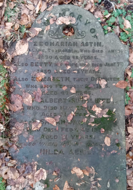 According to later census returns the Astins were resident in Todmorden by 1822 when their second child we know of, Elizabeth, was born (Grace was a few years older). In neat two-year spacing after Elizabeth came William, Sarah, Henry, and finally James as before. The entire family were cotton weavers and lived in the Blind Lane area of Todmorden for many many years. In 1859 Betty died and was buried here, followed by daughter Elizabeth in 1865. Zechariah continued on living with children Sarah and James until his death in 1870. A whistlestop tour of these first three names and lives but that’s all we have; they were born, they came here, they were weavers.