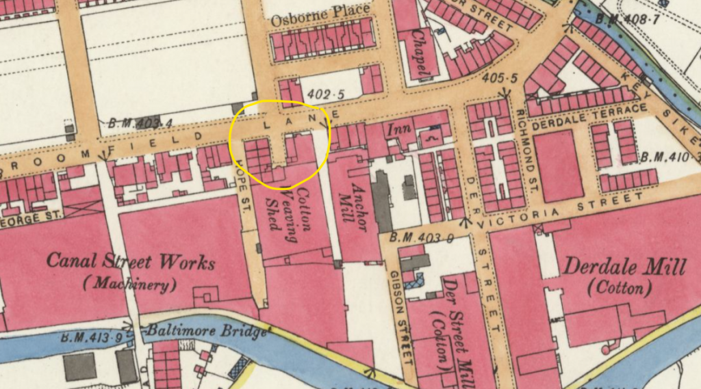 In 1881 the Hogans were living on the now more or less vanished Albert Street in the town centre, and Winifred was working as a cotton slubbing frame tenter. Later that year Mary got married to William Butterworth of 21.34 and settled over towards Roomfield Lane, aka Halifax Road, and it looks as though William and Winifred moved that direction as well, and possibly took up work at Croft, or Hope, or Albion Mill, or indeed any of the many other mills there. It was probably Croft Mill though as she and William took up residence at 5 Croft Bank (within the yellow circle on the map below) which bounded onto the small mill building.