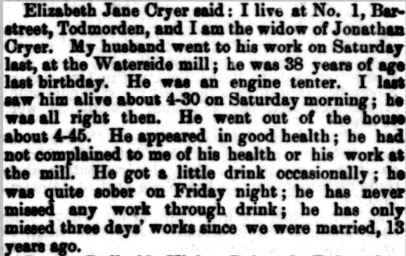 They probably expecting at least one of those sons to follow their father’s footsteps into Waterside Mill. Jonathan was an engine stoker so would have had to be very strong and fit to do the work. A worry, given his own father had died suddenly in his early 50s from no obvious cause. Unfortunately those two Johns shared not only a name but a fate, because 1889 delivered two crushing blows to the family. First Jonathan and Elizabeth’s only daughter, Eliza Ellen, died in September 1889 from unknown causes. Then in December Jonathan, while tending an engine at work, suddenly slumped to his knees, struggled to get any words out, and died minutes later.