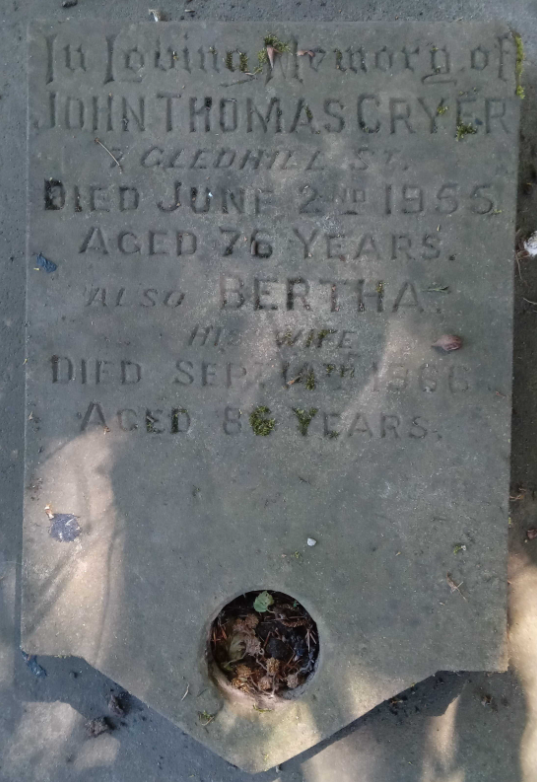 A story that encompasses the church, the school, and the graveyard itself; what more could we want? This grave story is only a half-told one though, because the latter two inhabitants died lately enough that there will be memories out there of them beyond the public record – and we want to hear them! So this writeup will initially only cover John Thomas and Bertha, with the second half to be added later. You, the reader, might be a key contributor…