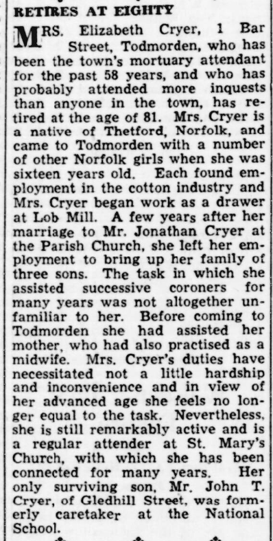 Elizabeth managed to make it work without remarrying, but the 1891 Census shows her at home doing housework, and our John here working as a throstle doffer at age 12 – the only one of the children old enough to work. Her youngest son William Edward had only been born in 1889. As time went on though she was able to take on paid work, and her links to St. Mary’s paid off. She was hired as the female caretaker for National next to the graveyard here, and also (although we only know this from her retirement in 1846 at the age of 91 – 91!!!) worked as a mortuary assistant. That’s one of the reasons we’re devoting more than just a few lines to her…countless “residents” of the yard here were washed, dressed, and prepared for burial by her.