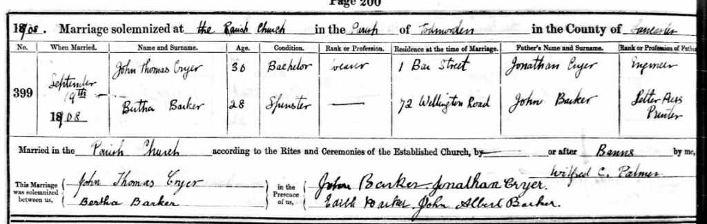 Anyway, back to our story. John became a cotton weaver, maybe to spare the stress on his blood vessels and his mother’s nerves, and was slow to marry compared to some at the time. He also became involved with the Young Men’s Association at Christ Church. While attending services our John would have noticed a young woman who was there probably more often than he was: Bertha Barker of Wellington Road. Bertha was the seventh daughter of John and Susanna Barker whose stories and losses have already been told here. Losing her mother at the age of ten can’t have been easy but as her father and brother John Albert became more involved at Christ Church she became a regular attendee too. The Barkers were comfortable enough but still of the working class, John being a letterpress printer, but by the time Bertha was in her 20s John Barker had cemented his place in civic life, whether on the Cooperative Society’s Educational Committee, the Town Board’s and later Council’s Library Committee, and the church’s Sick and Funeral Society. He would have had a good working relationship with Elizabeth, no doubt!