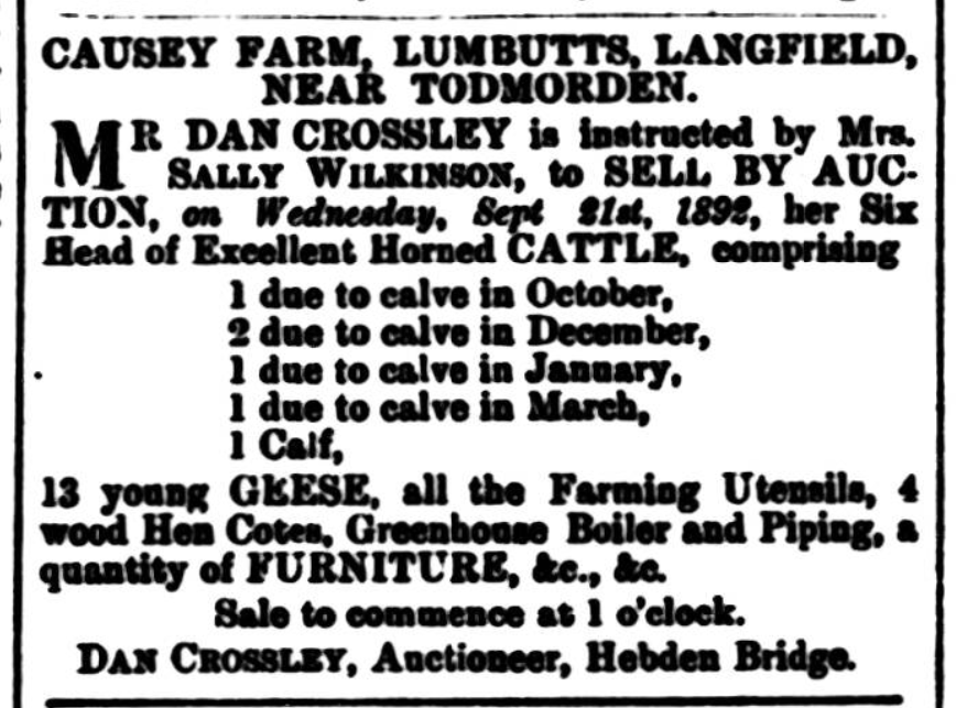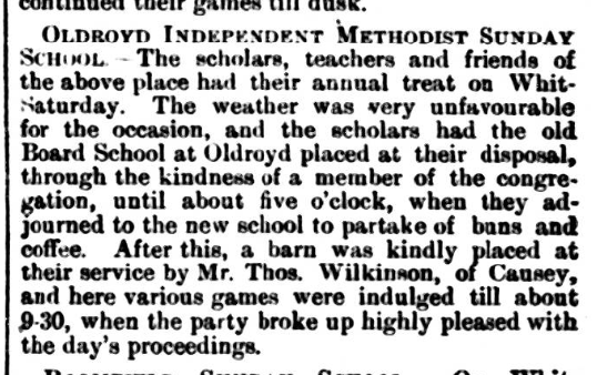Thomas and Sally had eight children together, starting with Crossley in 1860 and ending with Emma in 1876 (Emma is buried in an unmarked grave at 13.1 with her husband Francis Brammah, so more on them another time). They stayed at Cross Lee for a long time but by 1881 had taken up residence on farmland at Causey or Causeway Farm (on the way from Woodhouse Mill up to Lumbutts) where Thomas was farming 16 acres by 1881. His main crop wasn’t a plant but an animal – cattle, with a side order of geese. All the children were working as weavers or spinners so we wonder who was helping out with the livestock? It isn’t clear. We do know though that the Wilkinsons were devout Methodists, and supported Oldroyd Chapel by letting them use barns or fields for their Whitsunday events.