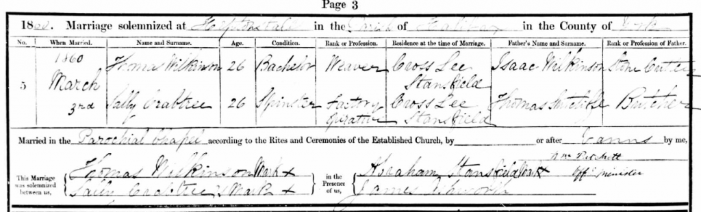 Sally would later name her father as butcher Thomas Sutcliffe – was he William’s father? He and Susan never married so who knows. Susan and Isaac met somehow, and in 1849 the two married. In 1851 Isaac, Susan, and their remaining children (Thomas, Sally, Betty, Rachel and Henry) were living at Cross Lee where Isaac was working as a stonecutter, Thomas as a power loom weaver, and Sally as a cotton spinner. On that census Sally is described as a “daughter in law” rather than stepdaughter. Who here likes foreshadowing?