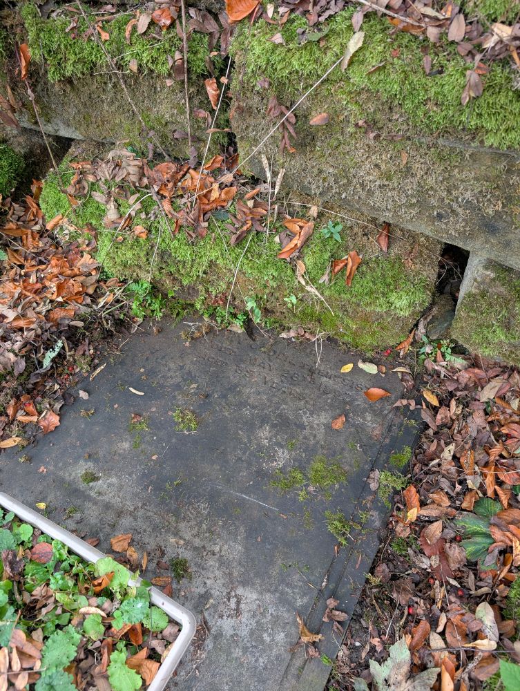 Other elements within these photos immediately caught our eyes – look at the image taken from the back slope looking down towards the school path. Firstly, so many trees which have had to be removed! Secondly…those flat ledgers…they’re the ones the retaining wall was built on top of. Which means the standing headstone to their right is the mysterious lost Baldwin stone, that we spent forever looking for in 2023 and 2024. It is sandwiched between the two walls. Can it ever be revealed and transcribed fully? Good question – depends whether that wall was built solely to reinforce some parking spaces the first or second owners of the church created or whether it’s structural. It’s rather crude so we suspect the former, but without a surveyor to come and examine it we will never know.