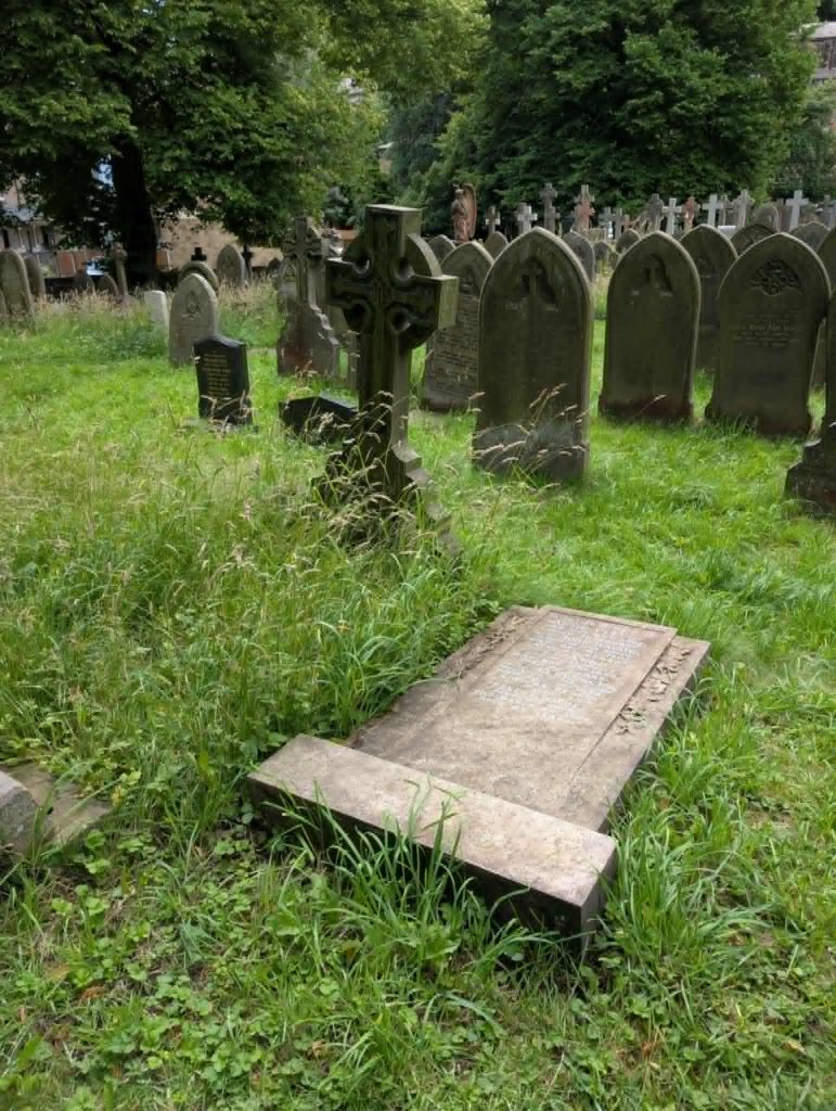 Topically, after the death of a small child at Rawtenstall Cemetery the other week, the subject of safe stones is on everyone’s minds here. One of the unintended consequences of the sidestone sales is that a number of headstones became unsafe as a result, because they were anchored not by being sunk into the ground but by the sidestones themselves. Here’s one such example, zoomed in on, that shows you how something which was once quite large and grand is now fated to remain on its back in the grass.