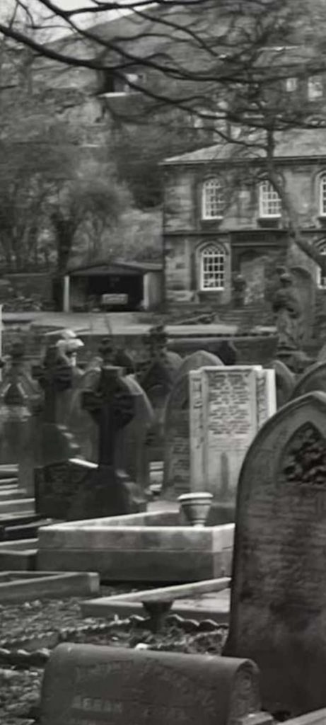 Other elements within these photos immediately caught our eyes – look at the image taken from the back slope looking down towards the school path. Firstly, so many trees which have had to be removed! Secondly…those flat ledgers…they’re the ones the retaining wall was built on top of. Which means the standing headstone to their right is the mysterious lost Baldwin stone, that we spent forever looking for in 2023 and 2024. It is sandwiched between the two walls. Can it ever be revealed and transcribed fully? Good question – depends whether that wall was built solely to reinforce some parking spaces the first or second owners of the church created or whether it’s structural. It’s rather crude so we suspect the former, but without a surveyor to come and examine it we will never know.