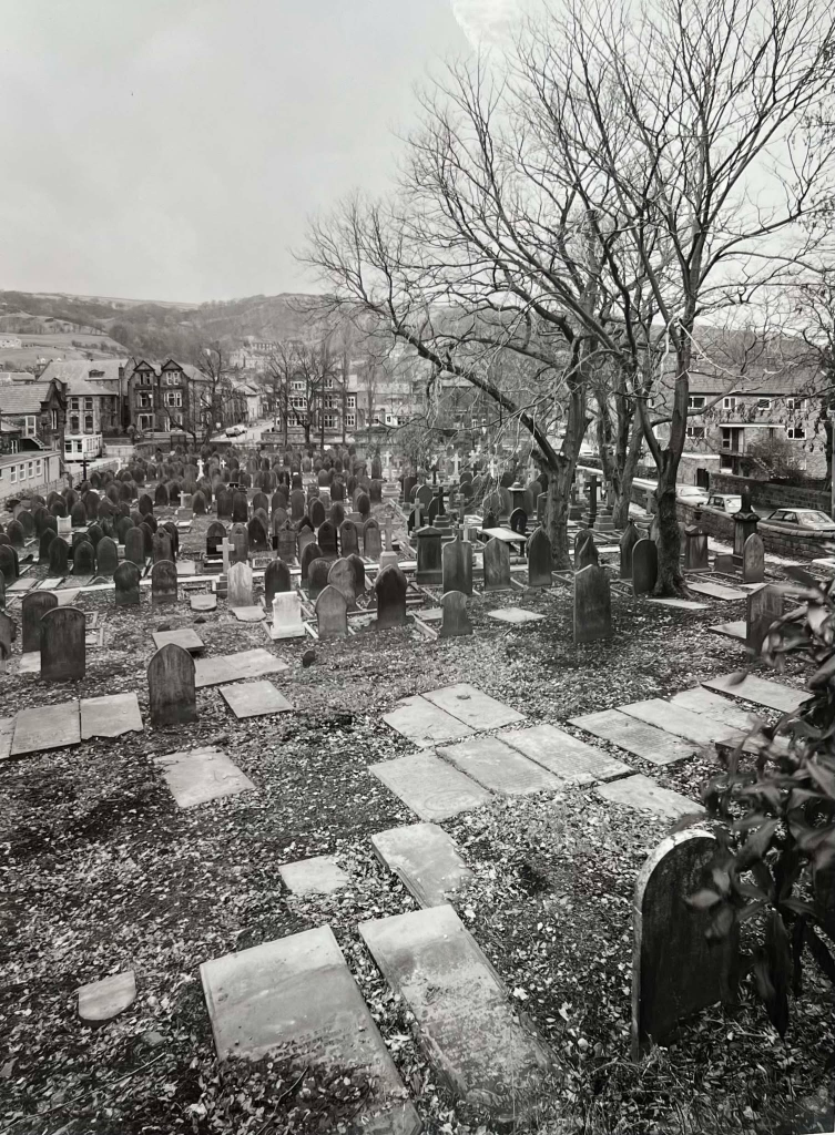 Secondly: our Treasurer found a bundle of photographs in his attic and immediately jumped for joy, hitting his head on a beam in the process, and handed them over to me to peruse. They’re high quality black and white photos of the interior of the church and exterior. No, before you ask…no photos of the “contested space” under the school extension (for which we are still awaiting the Diocese to open a consultation period on…), but still very very useful to us. They were taken by the Royal Commission on Historic Monuments, in 1986, around the time that paperwork was beginning to circulate within the Diocese of Wakefield regarding the possibility of closing Christ Church. They show a meticulously groomed graveyard from a number of angles, and show us what the place looked like before Peter Calvert sold the unmarked sidestones in 1991 and before any paths were carved through the yard to go to or from an at-that-point nonexistent school extension. Historic England has kindly granted us permission to reproduce four of the photos online so here they are.