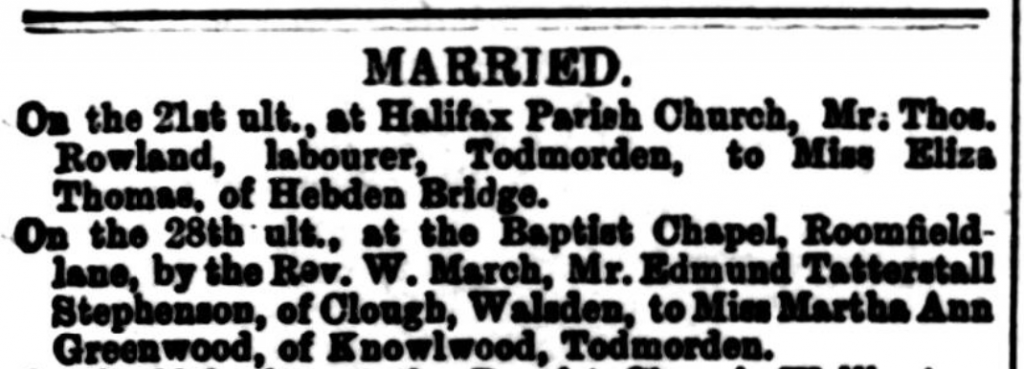 Martha Ann Greenwood was also born in 1860, a few months earlier, and also near Bacup – in her case it was Lumb. Her parents Robert and Jane (Holt) started off as weavers and were also travellers. Robert was originally from Briercliffe and Jane was a Heptonstall lass, but they were also willing to travel for work and within a year of Martha’s birth had come to Lydgate to live at Canteen and work in the mills there. 1871 found the Greenwoods up in Halifax, but they came back to Walsden in time for August 1880, when she and Edmund were married at Roomfield Baptist. An interesting choice given that by now the Stephensons were living at Inchfield Buildings, but maybe they had a sentimental connection to the place.