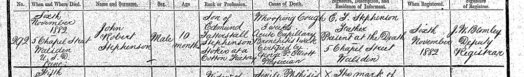 Another reason to perhaps get married a few miles down the road was that Martha Ann would have been a visibly pregnant bride – their first child, daughter Harriet Jane (named for both their mothers), was born in November. Next came John Robert (named for both their fathers), born in January 1882. Poor little John Robert fell prey to the usual dangers of Victorian childhood and two years after the birth of their first child Edmund and Martha lost their second. Whooping cough and acute bronchitis were the culprits.