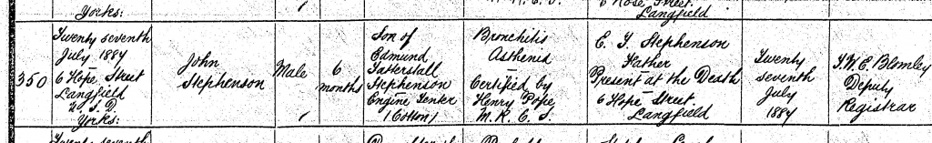 This little John, the second son and third into this grave, is also likely the last burial in this grave. The 1891 Census shows the Stephensons in Shaw, well away from Todmorden, and they would stay well away for the rest of their days. They had four more children, two daughters and two sons, none of whom were named John. Martha died in 1943 and Edmund in 194 and both are buried at Shaw Cemetery, along with some of their adult children.