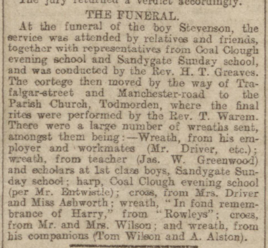 Harry Victor was apprenticing at a local musical instrument manufacturer and learning how to build organs. He was also a typical 16 year old boy who had friends and loved larks. One Sunday morning in January 1904 he left home saying he was going for a long walk, and went first to fetch one friend named Albert Alston and then another named Thomas Wilson, and they decided to go all the way down to Hameldon Hill and to the quarry there. They knew no one would be there on a Sunday and it was full of fun things to do. They ran around, threw some stones, and even got a crane running so they could tip over a large box of rocks. Then Harry jumped on top of a railway bogie (a wheeled base for crates and boxes) and told his friends he could operate it with his knee while pushing with his other foot and not to worry because he would jump off before it got to the rock tip. He managed to get it going but couldn’t jump off. He hit the rock tip and was sent flying, and when his friends ran to the hole where he had landed they found he was dead.